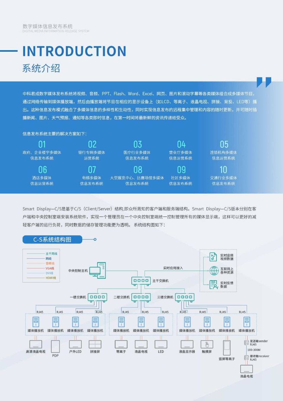 中科君成数字媒体发布系统是公司在多年工程项目经验积累的基础上打造形成的:在成功解决多项重大项目难题基础上,形成了应用于不同领域的十几种完整解决方案。涉及弱电、安防、综合系统集成、政府、大企业、酒店宾馆、银行、商超、学校等领域。